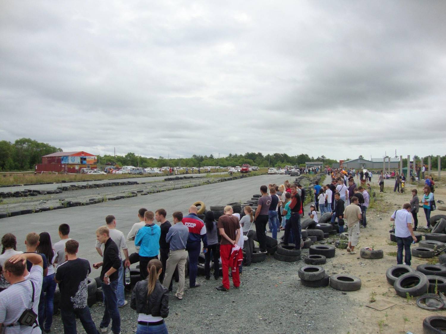 В 12:40 Серега опять за мной заезжает... полдень все-таки не 4 часа утра , Серега в плотном потоке ипошит, боясь опоздать Вьезд и вход оказался платным, 100 за ведро, 50 за тело... Поставили машину, я по пути на "трибуну" в виде той самой горы покрышек, прошел через место старта, где проходил брифинг, поздороволся с Синим, и еще несколькими знакомыми... блеать, все друг друга знают