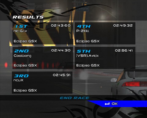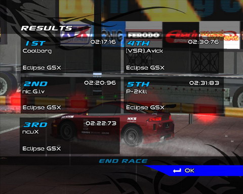 | Выложу сюда заодно и свой конфиг, а то в прошлый раз вопросы были. Итак, немного потренировавшись и поколдовав в гараже у меня получились вот такие вот пироги: Mitsubishi Eclipse GSX Обвес: полный, третьего уровня Антикрыло: Zychos, высшего уровня Диски: OZ Superturismo Комплектующие: все прототип Коробка передач: максимальная скорость Высота подвески: Nissan 350Z Обвес: полный, третьего уровня Антикрыло: Zychos, высшего уровня Диски: OZ Superturismo Комплектующие: подвеска Bilstein 3-го уровня, остальное прототип Коробка передач: максимальная скорость Высота подвески: