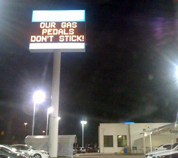 | Не совсем ссылка, но тоже из интернета... Возможно, кто-то уже знает о том, что в США и Европе, Тойота отзывает 2,3 миллиона автомобилей, по причине того, что педаль газа в них имеет свойство залипать в положении "в пол". Косяк серьезный и всё такое... Но один из дилеров Хонда в той же Америке разместил на экране рядом со своим шоу-румом следующую картинку Надпись на экране гласит - Наши педали газа не залипают!